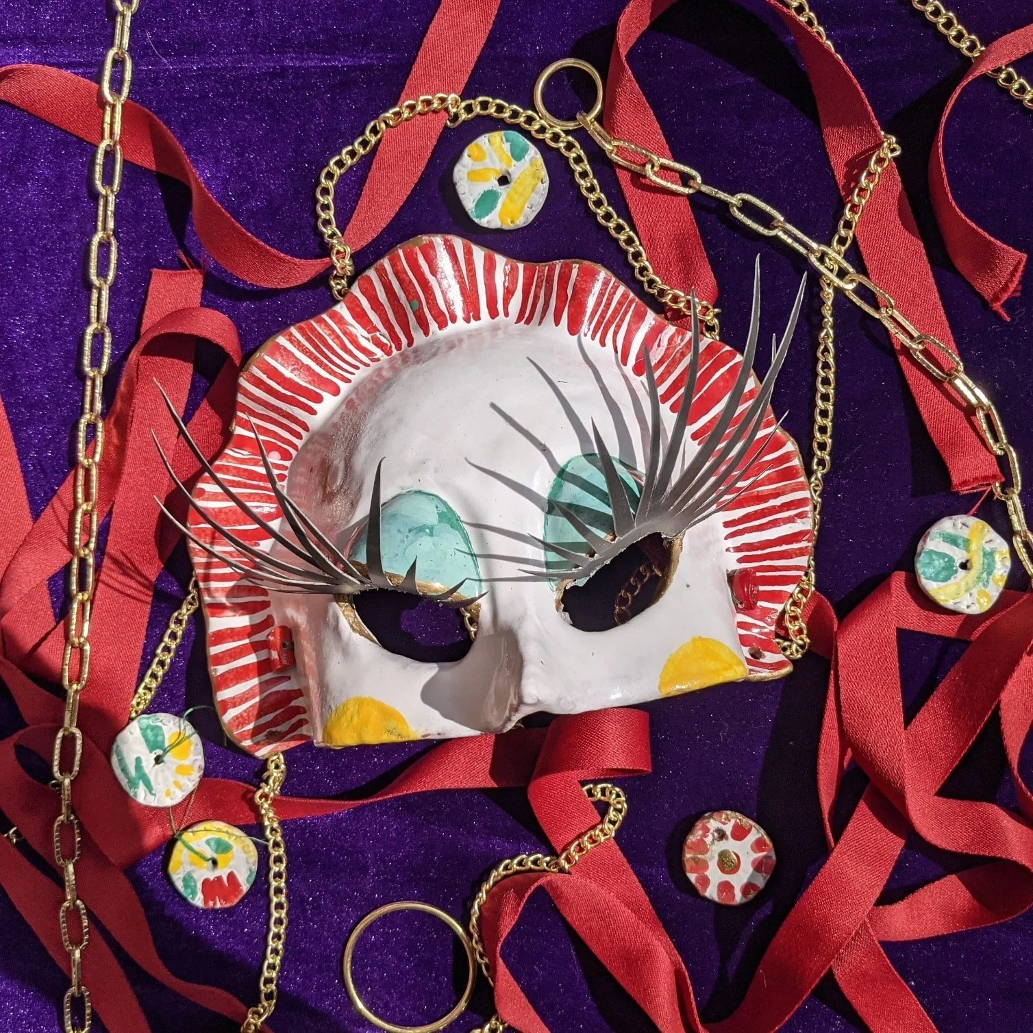 Materials: Terracotta, Majolica glaze, chain, metal couplings, textiles.